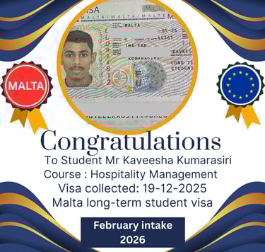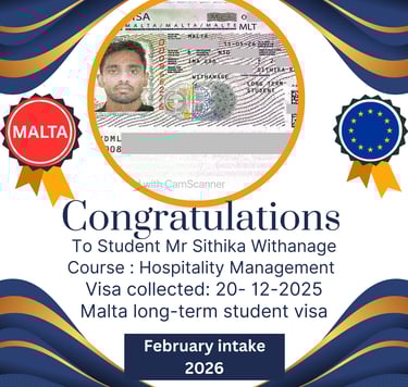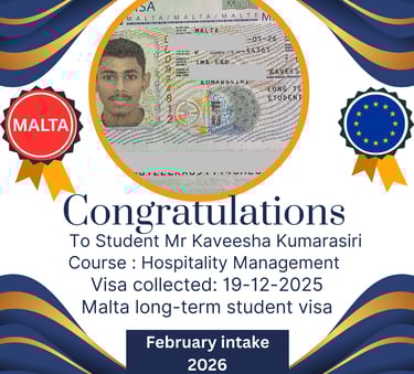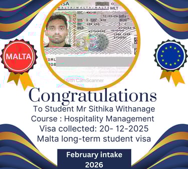 In this inspiring video, discover the incredible story of a Sri Lankan student who was working in the Maldives' hospitality sector as an accountant until he secured his student visa to study Hospitality Management in Malta! Guided by Talnet Private Limited, an experienced student consultancy agency, his success proves that with the right support, your dream of studying abroad can become a reality.